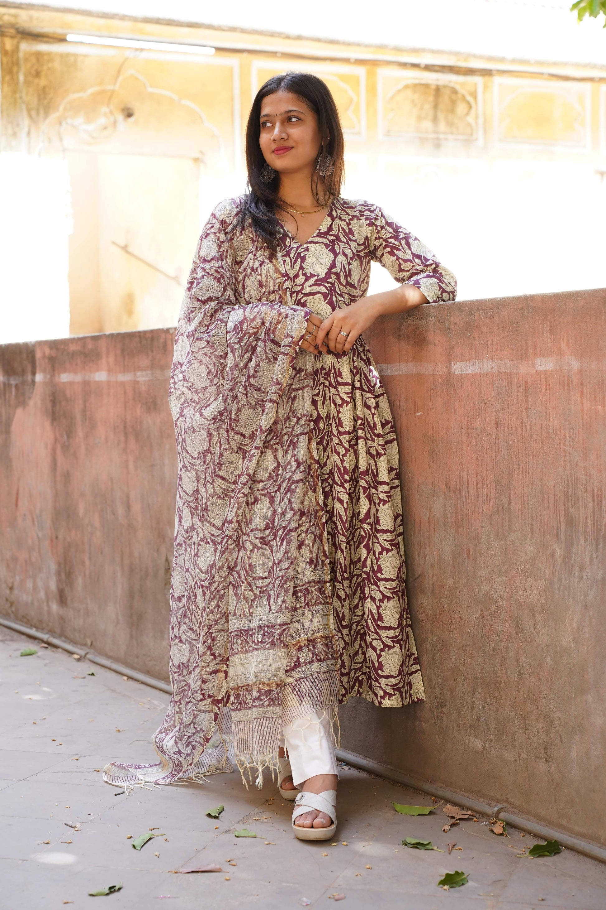 Elevate your ethnic wardrobe with this elegant Mirari Handblock Print Alia Kurti with Plain Pant & Kota Doriya Dupatta, beautifully paired with a printed pant and a lightweight Kota Doriya dupatta. Crafted from breathable and soft rayon fabric, this ensemble is perfect for festive gatherings, family functions, or casual cultural events.